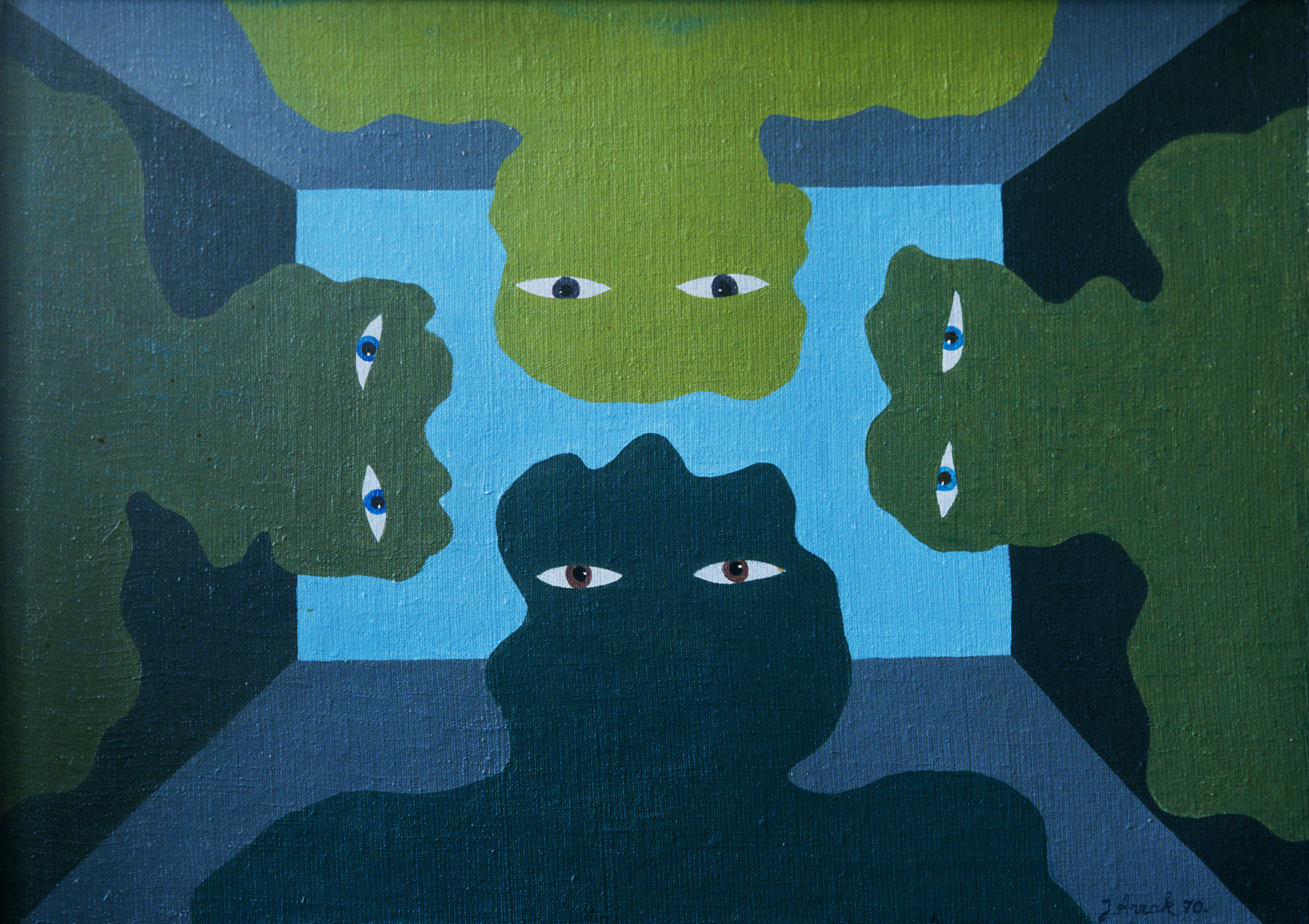 This is speculation on the part of the author here (the artist does not remember, as has been noted), but the exploding head of “Incident” would seem to have provided the key in its brutal concreteness to making sense of the “maiv”. The best illustration of this is “The Table” (1970, oil). In the popular laconic style, a long table is depicted in central perspective, with the main speaker at the far corner and a couple of figures seated on either side. The viewer’s gaze is drawn across the table, creating three groups. In the first, closest to the viewer, we see two shabby figures, Arp-like amorphous creatures rather than dignified “maivs”. They are followed by a couple on the side of the main speaker: more active, more attentive, more clearly listening. Here, the influence of Arp is increasingly difficult to see: the form of the listeners seems more concrete, the activity of thought expressed in the growing “horns”.