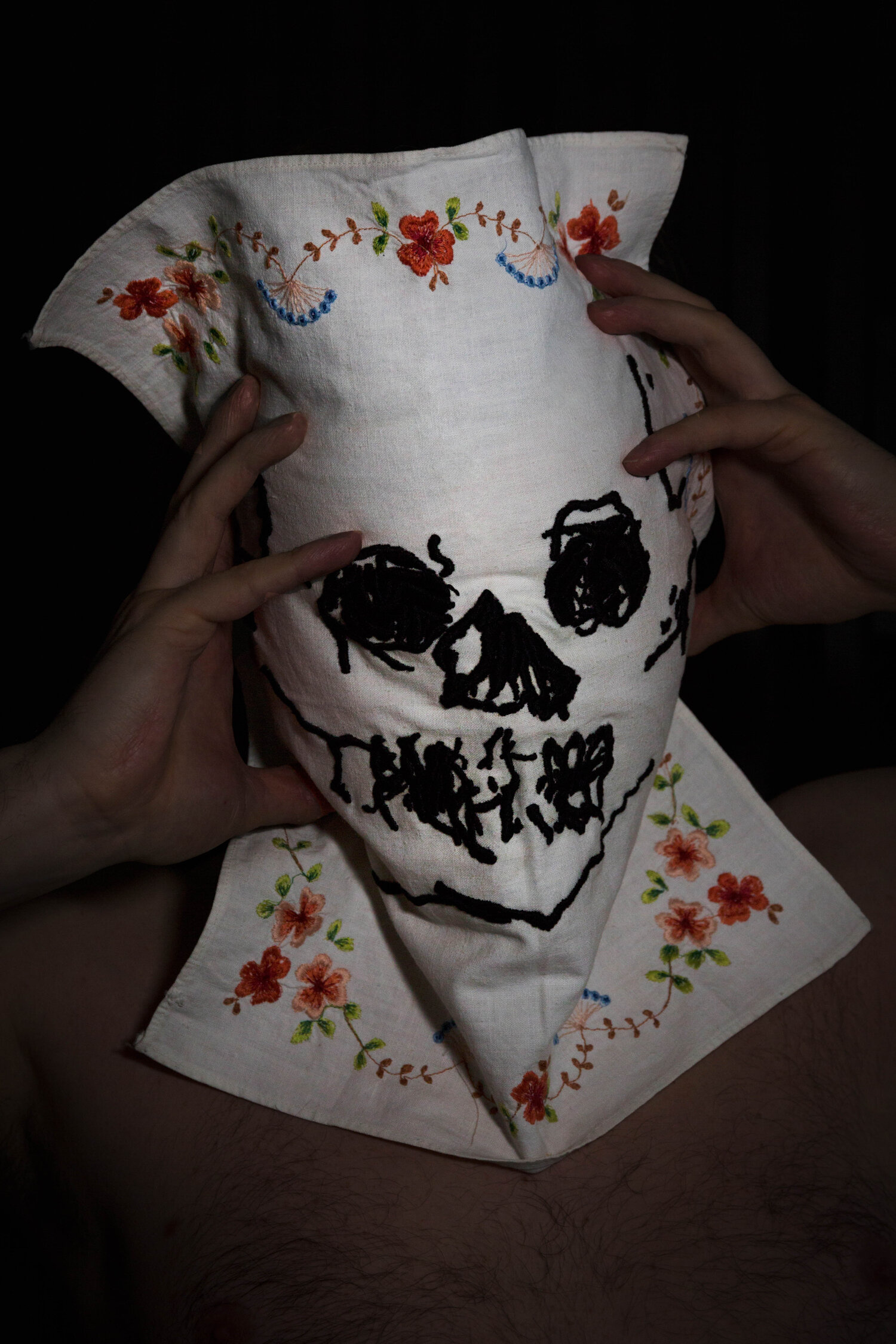 Galeriis mängitakse pimesikku, siin hõljuvad lae all autoportreed, milles vanaema tikitud linikuist on saanud läbitungimatud maskid kunstniku enda palgeil. Või siiski mitte? Kunstnik piilub mind, vaatajat, valgete linikute heegeldatud mustriaukudest – kui pangaröövel sihtotstarbeliselt disainitud suusamütsis. Piir linikute ja piiluja vahel on voolav, mänguline; linik dikteerib suhtlust, surub peale identiteeti ja väljanägemist – kunstnikust saab aegamisi pangaröövel või siis identiteedivaras. Muidu nii rõõmsameelsetesse lillornamentidesse sulandub tasapisi süsimustaga visandatud kuratlikku irvet, veidi karlssonlikku voodilinatonti, selle peale aga juba sadomaso päitseid ja ahelaid, mis muudavad kogu mängu reegleid. Jah, kuratlik kaksik on saanud enda kätte jämedama otsa ega häbene oma võitu – Dorian Gray portreelt vaatab vastu hirmsa moega alter ego.